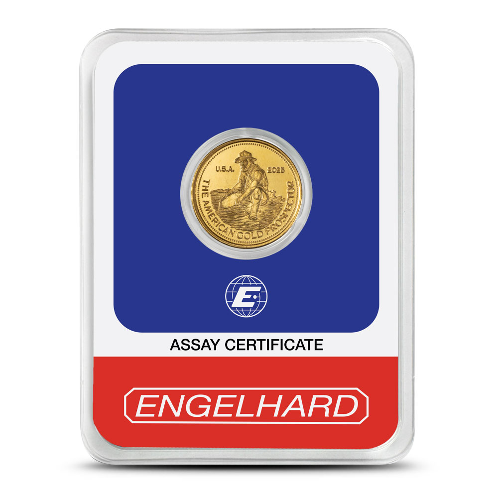 Each 1/10 oz Engelhard Prospector Gold Round has proof-like qualities, with frosted details and reflective surfaces. Every round is individually packaged in a sealed assay card, and this release is capped at a total of 5,000 pieces.