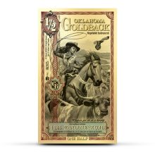 Each 1/2 Oklahoma Goldback Gold Note comes sealed in its own protective sleeve. These notes are made from 24-karat gold and now feature updated UV security elements on the reverse side. The 1/2 Goldback is currently the smallest note offered in the Oklahoma collection.
