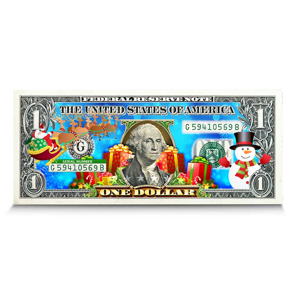 On the front of the Merry Christmas Legal Tender Note, youll see the portrait of President George Washington, with additional colorized graphics featuring Santa in his sleigh, reindeer, wrapped gifts, and a festive snowman.