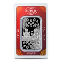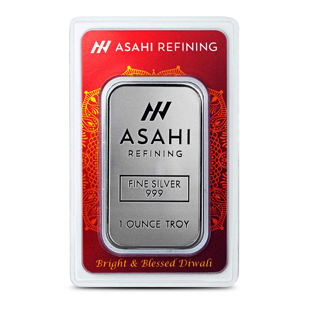 All 1 oz Asahi Diwali Silver Bars available here are new products from Asahi Refining. Each bar comes sealed in an assay card with a special red card designed for the Diwali celebration.