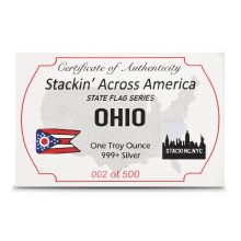 Each 1 oz Colorized Stacking Across America Ohio State Flag Silver Bar is protected inside a plastic capsule and is one of the 50 bars in the series. The obverse design stays the same for every bar, while the reverse highlights the unique flag of each state.
