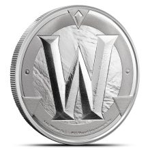 The obverse of the Colorized Replica WoW Token Silver Round features a blue background with a large gold W and gold ring, as well as a red gem at the top. The reverse mirrors the same layout without any added color, offering a silver-only look. This rounds artwork is based on the WoW tokens that let players buy in-game gold with real money.