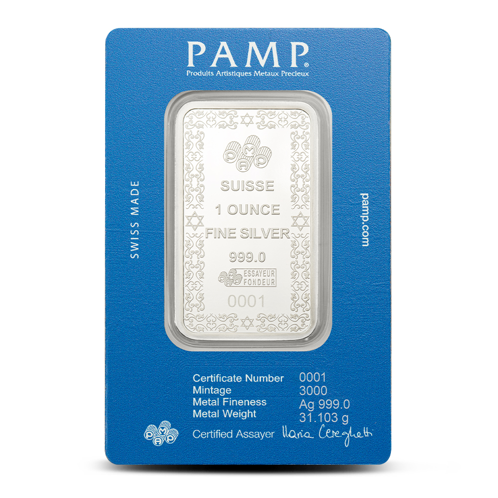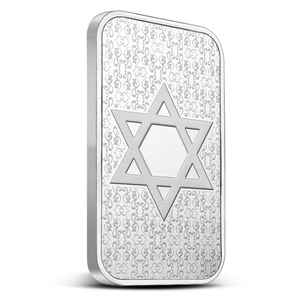 In Jewish tradition, the Star of David is a powerful emblem with both cultural and spiritual meaning. Created from two interlocking triangles, the design is often understood to symbolize the relationship between God and humanity one triangle reaching upward toward the heavens, the other pointing downward toward the earth. BGASC is pleased to offer 1 oz PAMP Suisse Star of David Silver Bars for purchase.