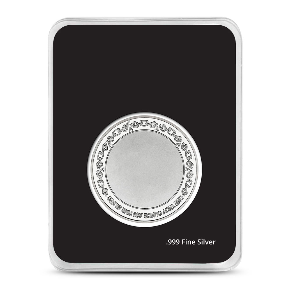 For the reverse field of Liberty Eagle Silver Rounds, SilverTowne has left the central field blank. This design field is left blank on purpose to accommodate custom engraving at the mint, but arrives at retailers with this blank element. There is, however, a decorative wreath around the field with inscriptions of the identifying hallmarks.