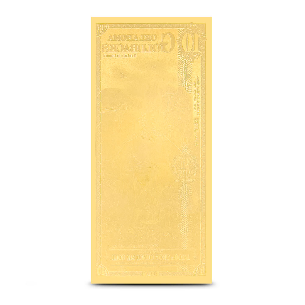 Each 10 Oklahoma Goldback Gold Note comes sealed in an individual protective sleeve. The notes are crafted by layering a precise amount of 24-karat gold within durable polymer sheets. Every note in the series features its own design, and each includes a UV marker on the reverse for added authenticity.
