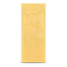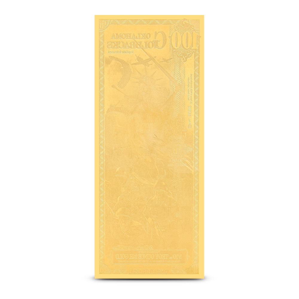 The 100 Oklahoma Goldback is currently the largest note offered in this states Goldback Series. Each note is produced with .9999 pure gold and packaged in a clear plastic sleeve to protect its detailed artwork. These gold notes are both visually engaging and offer fractional gold value for collectors and investors alike.