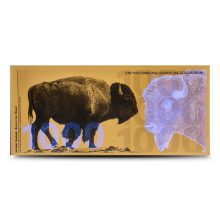 The obverse of the 1000 Milligram Aurum American Bison Gold Note depicts a large plains bison in the foreground with another bison placed further back in the design. A forest-covered mountain range fills the background. These animals historically played a vital role in grassland ecosystems, shaping the land through their natural behaviors. The reverse side includes a different depiction of an American bison and features a security element that only becomes visible under UV light. This detail helps verify the authenticity of each gold note and gives collectors more confidence in their purchase.