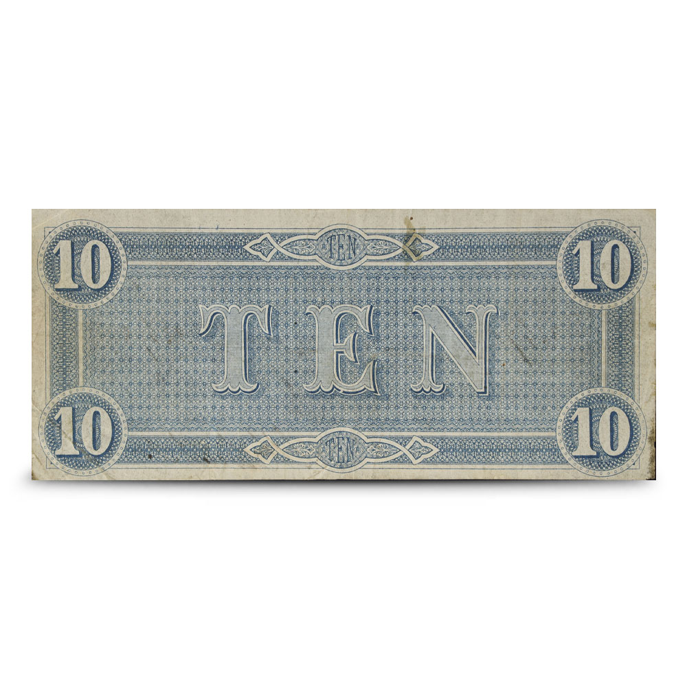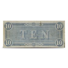 The reverse of the 1864 $10 CSA Notes features a straightforward design, displaying the word “TEN” at the center with the numeric value “10” in each corner.