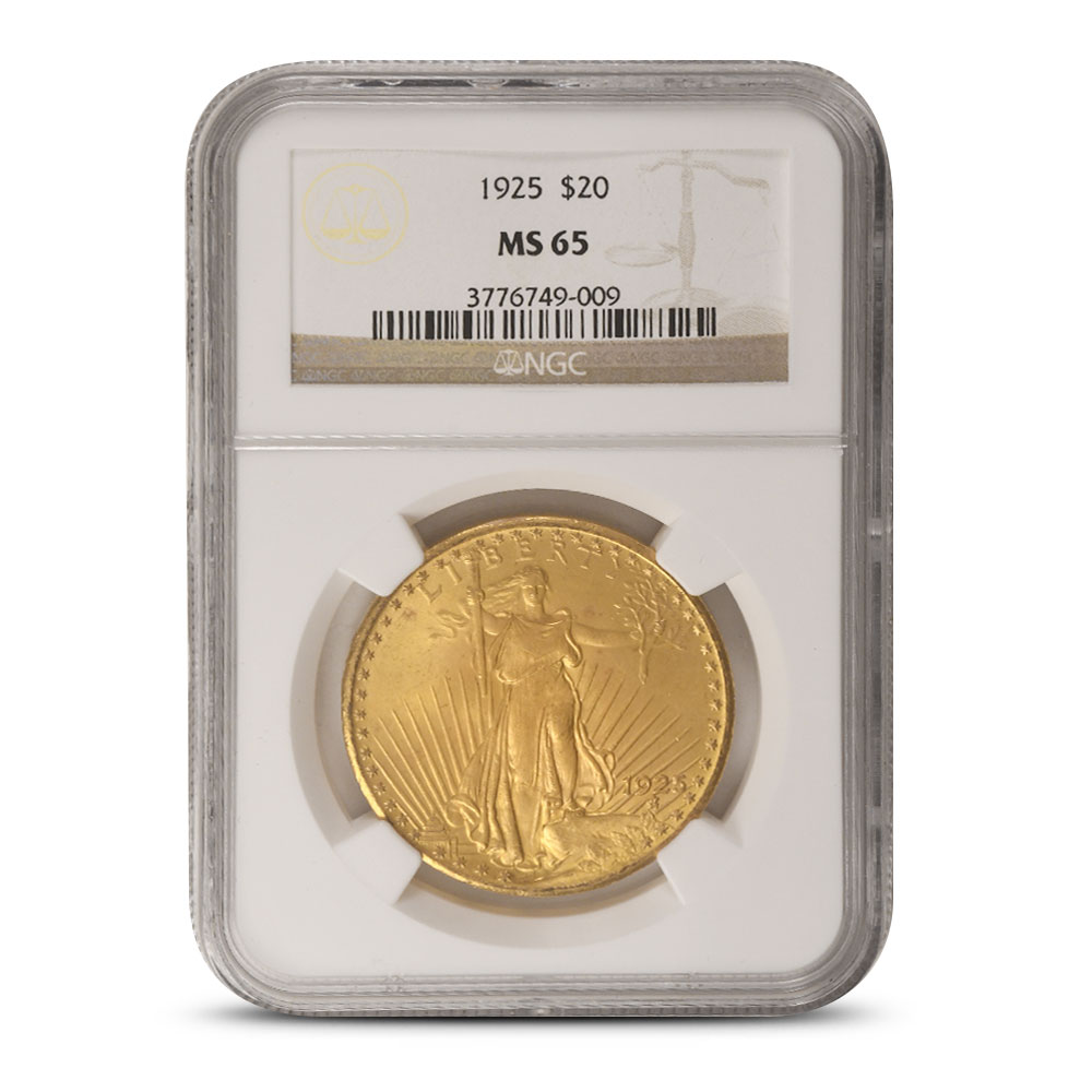 Each of these 1925 Pre-33 $20 Saint-Gaudens Gold Double Eagle Coins is available in Mint State 65 condition. Coins in this grade feature sharp details and a beautiful luster, with only small imperfections such as light marks or hairlines visible under close inspection. In 1925, the Philadelphia, Denver, and San Francisco Mints all struck Double Eagles, with the Philadelphia Mint producing 2.83 million coins in this series.