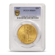 All 1927 $20 Saint-Gaudens Gold Double Eagles available here come graded as Mint State 65+. An MS65 grade notes coins with strong eye appeal, good shine, and only light marks spread across the surface. The plus indicates examples that are among the best within this grade range.