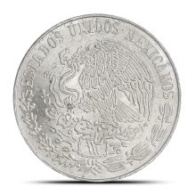 The obverse of the coin shows the official seal of Mexico. This includes a left-facing golden eagle perched atop a cactus, wings spread as it confronts a serpent with its beak and talons. Oak and laurel branches create a wreath along the base of the design.