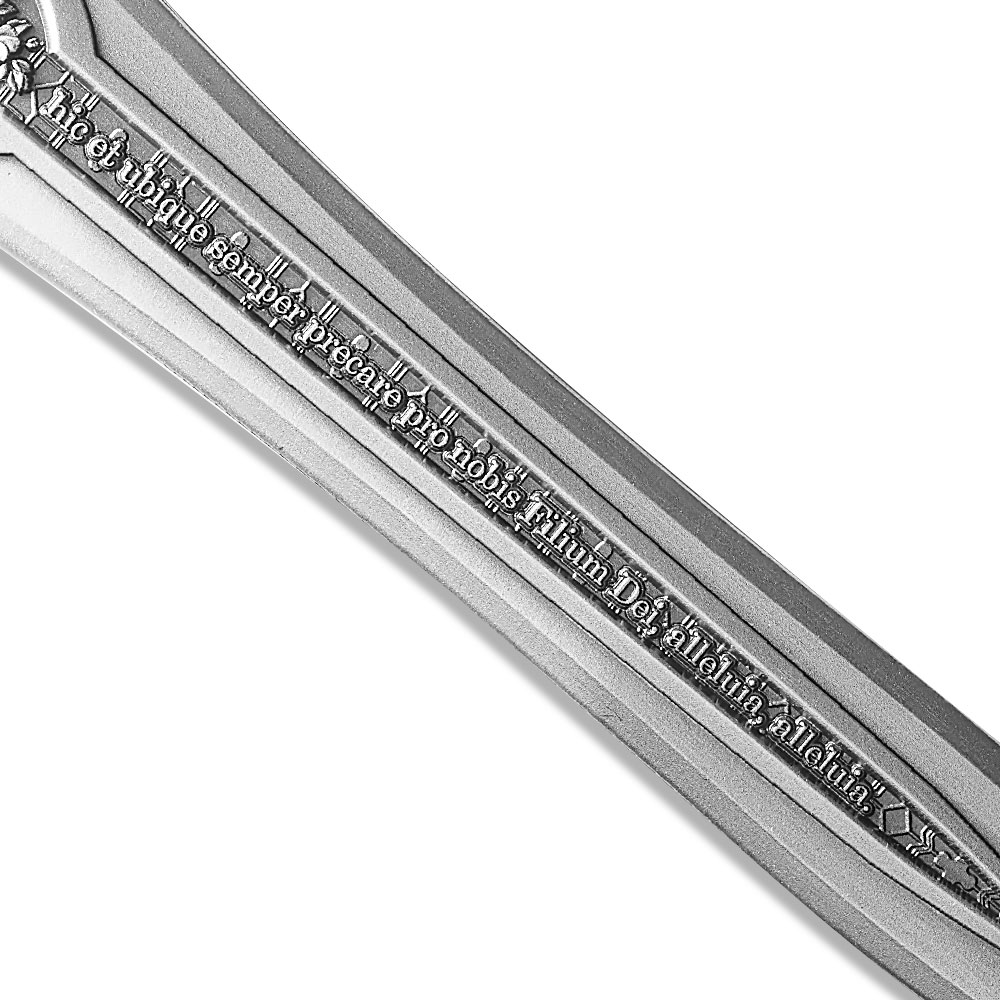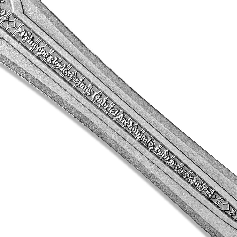 This silver bar features a single-handed sword design with a winged handle, bearing distinctive hallmarks. Inscriptions in Latin grace each side of the blade, reading PRINCEPS GLORIOSSIME, GABRIEL ARCHANGELE, ESTO MEMOR NOSTRI : HIC ET UBIQUE SEMPER PRECARE PRO NOBIS FILIUM DEI, ALLELUIA, ALLELUIA. Translated to English, this prayer invokes St. Gabriel, asking for protection and guidance in spiritual matters. It underscores the symbolic battle fought through prayer, faith, and divine truth.