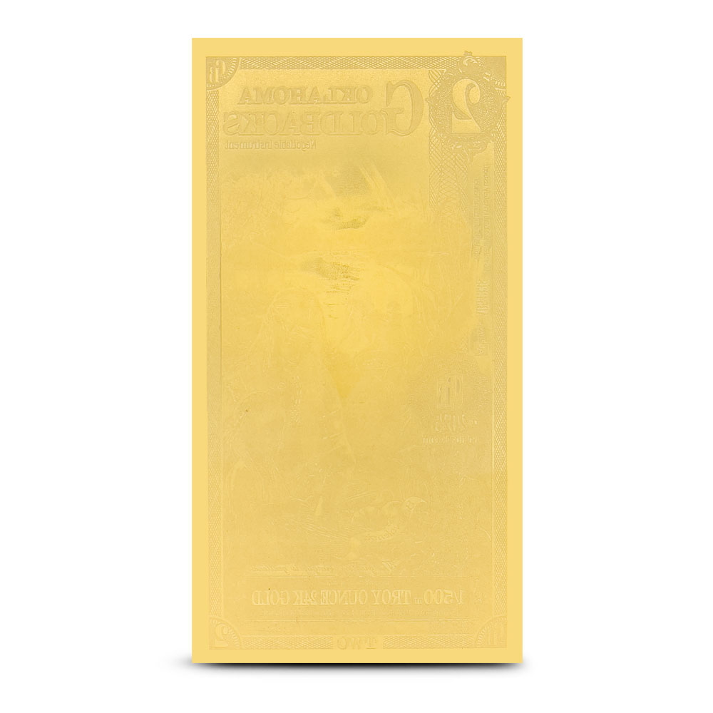 Each of these 2 Oklahoma Goldback Gold Notes arrives in a plastic currency sleeve for safe keeping. The Oklahoma Series features the full set of denominations available through the 2025 Florida Series, from 1/2 Goldback to 100 Goldback. Each note is also printed with a UV security mark on the reverse for added authenticity.