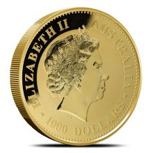 In the years from 1991 to 2009, the Perth Mint broadened its Australian Gold Kangaroo lineup by introducing several larger coin weights. Originally launched in 1986 with 1 oz and fractional sizes, the series welcomed 2 oz, 10 oz, and 1 Kilo coins in 1991. The 2 oz and 10 oz options were eventually discontinued in 2009. BGASC is proud to offer the 2000 10 oz Australian Gold Kangaroo Coin.
