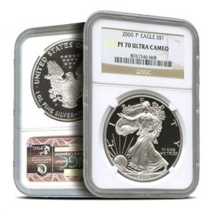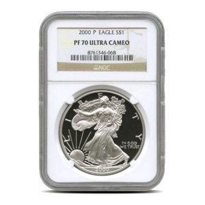 All 2000-P 1 oz Proof American Silver Eagle Coins at BGASC arrive in impeccable condition. PF70 coins boast full, original mint luster and are free from distracting flaws. UCAM, short for ultra-cameo proof, indicates strong, frosted designs with deeply-mirrored, clear fields.