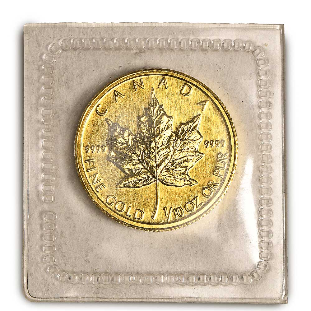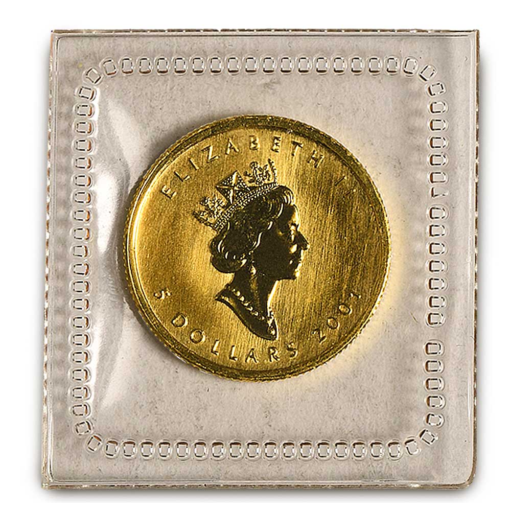 Each 2001 1/10 oz Canadian Gold Maple Leaf Coin offered here is shipped in a protective plastic flip. The 1/10 oz coin was one of the first fractional weights in the series, added in 1982 alongside the 1/4 oz version. These coins, along with the original 1 oz version, helped establish the series reputation for 24-karat gold purity.