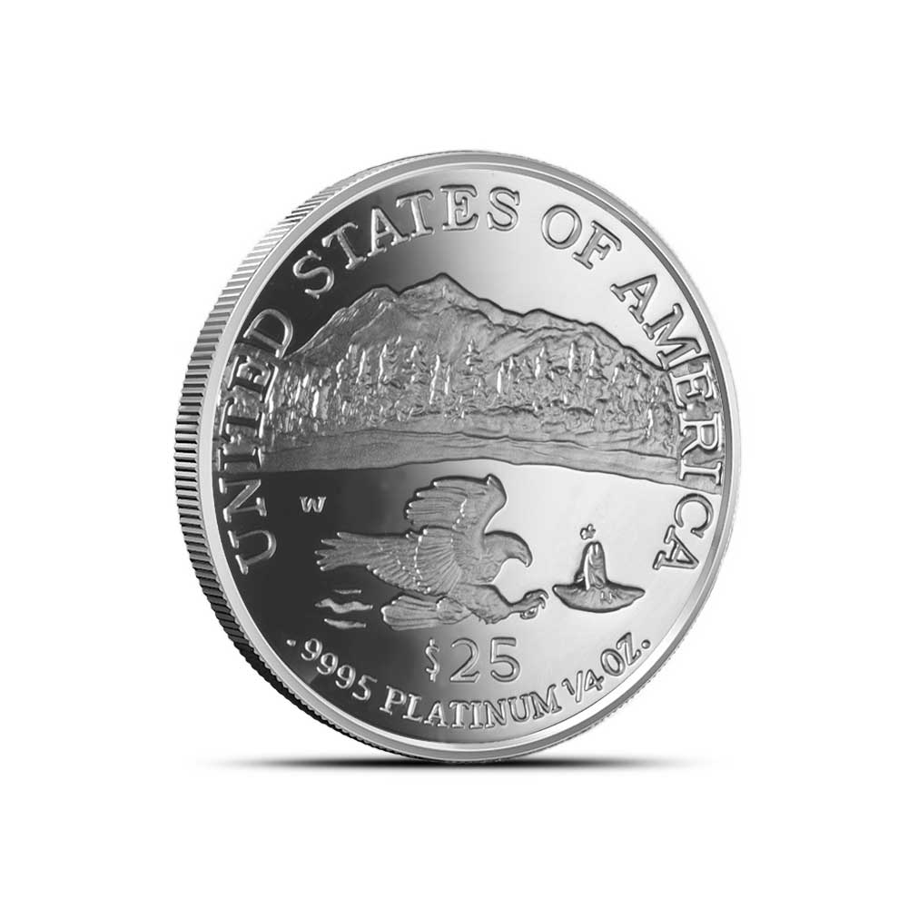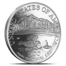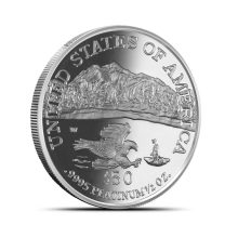 On the reverse of each coin, an American bald eagle is shown in flight, reaching down to catch a trout jumping from a lake. Snow-covered mountains in the distance frame the background and suggest a Northwestern U.S. setting. This is the final release in the Vistas of Liberty series.