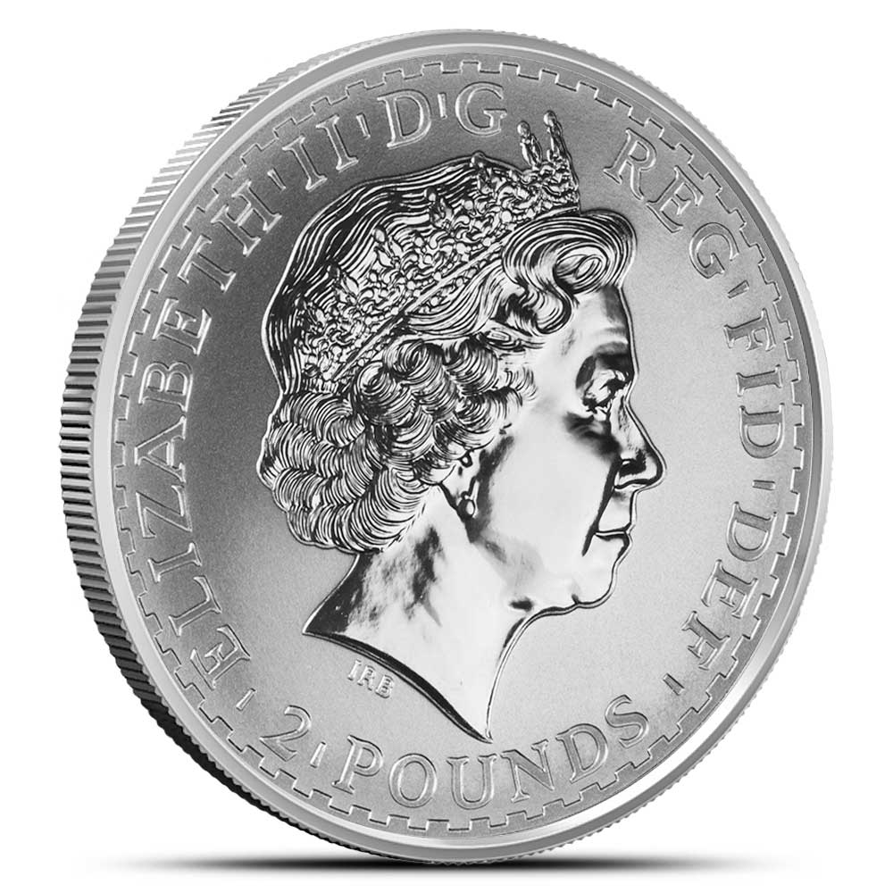 On the reverse side of the 2004 1 oz Silver Britannia Coin is Nathans original 1987 Britannia design. Britannia wears a Corinthian helmet, holding a trident in her right hand. Her left hand carries an olive branch and rests upon a shield with the Union Jack flag.