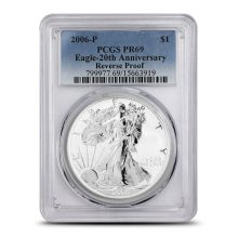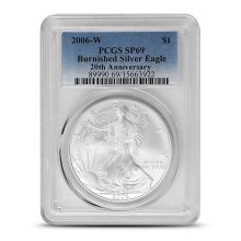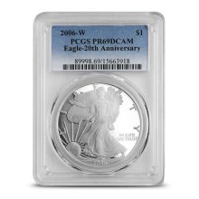 In 2006, the United States Mint celebrated the 20th anniversary of the American Eagle coin program, a major event for collectors and investors. First issued in 1986, the American Silver Eagle and American Gold Eagle quickly became the countrys official bullion coins. To mark this two-decade milestone, the Mint released a special 3-coin Silver Eagle set. BGASC is proud to offer certified 2006-W Proof American Silver Eagle 20th Anniversary 3-Coin Sets.