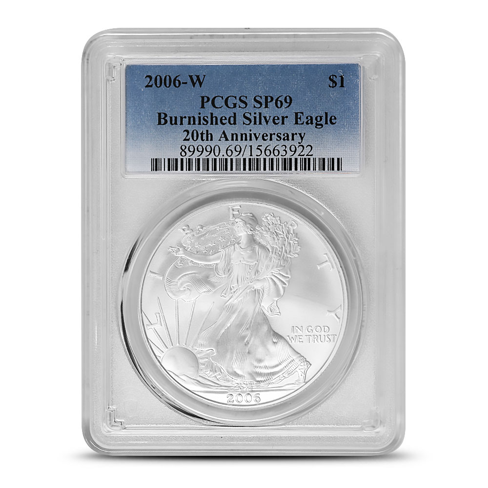 This 3-coin anniversary set includes three different versions of the Silver Eagle. Youll find the regular proof version from the West Point Mint, a one-time Reverse Proof from the Philadelphia Mint, and the Burnished Silver Eaglea new release introduced in 2006. The reverse proof design uses a frosted background and mirrored details, the opposite of the traditional proof style. The burnished coin stands out with its smooth, matte-like surface, achieved through a unique minting process that gives it a soft finish.