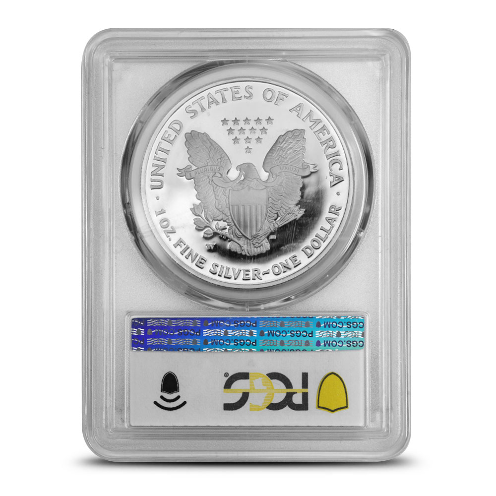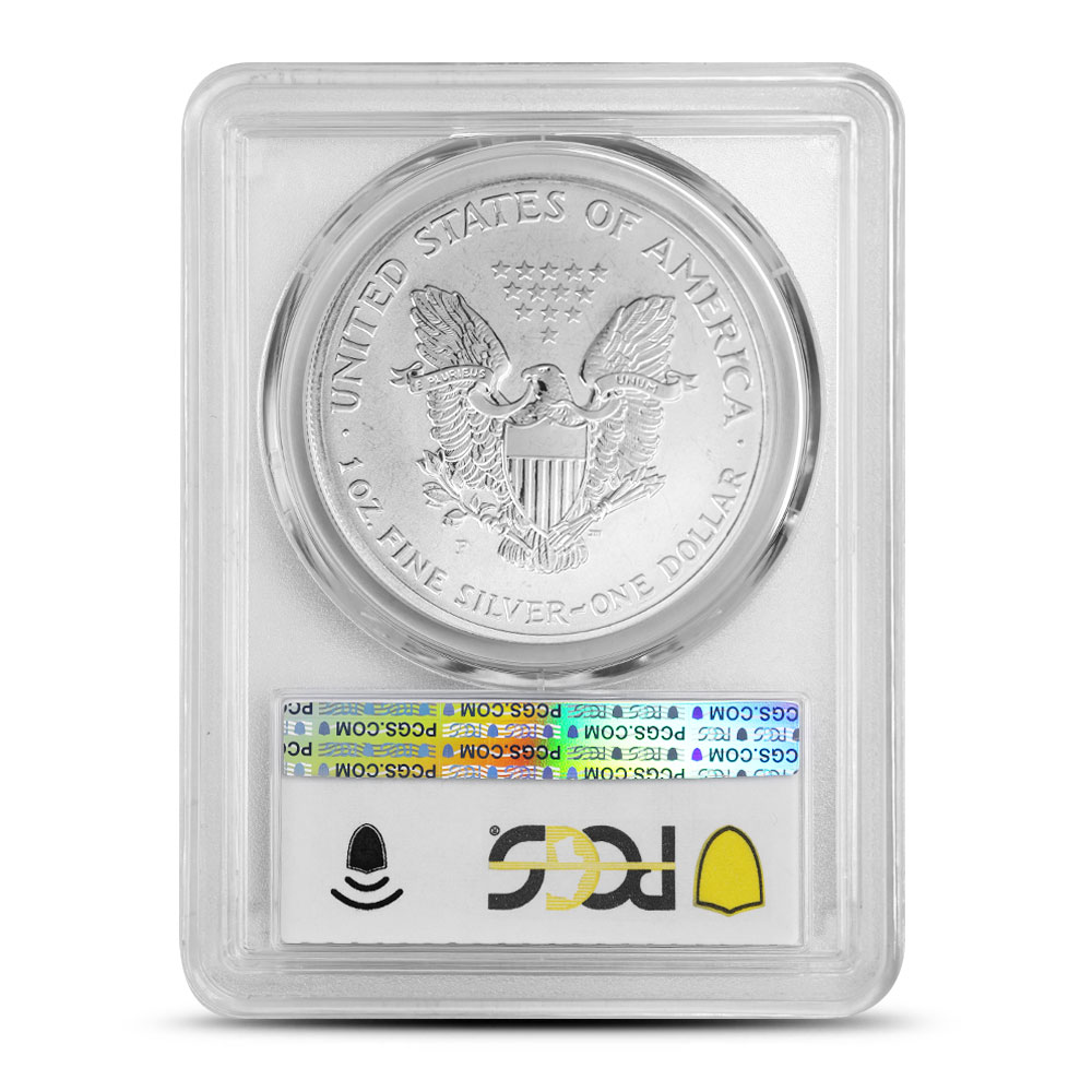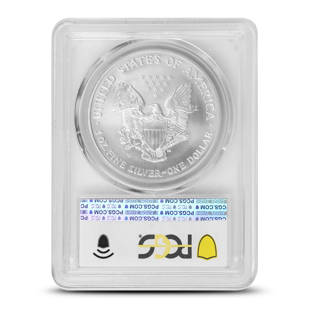 On the reverse side, the coin shows John Mercantis interpretation of the Heraldic Eagle. Inspired by early American coins from the 1790s, this design served as the standard reverse for the Silver Eagle from 1986 until it was updated in 2021.