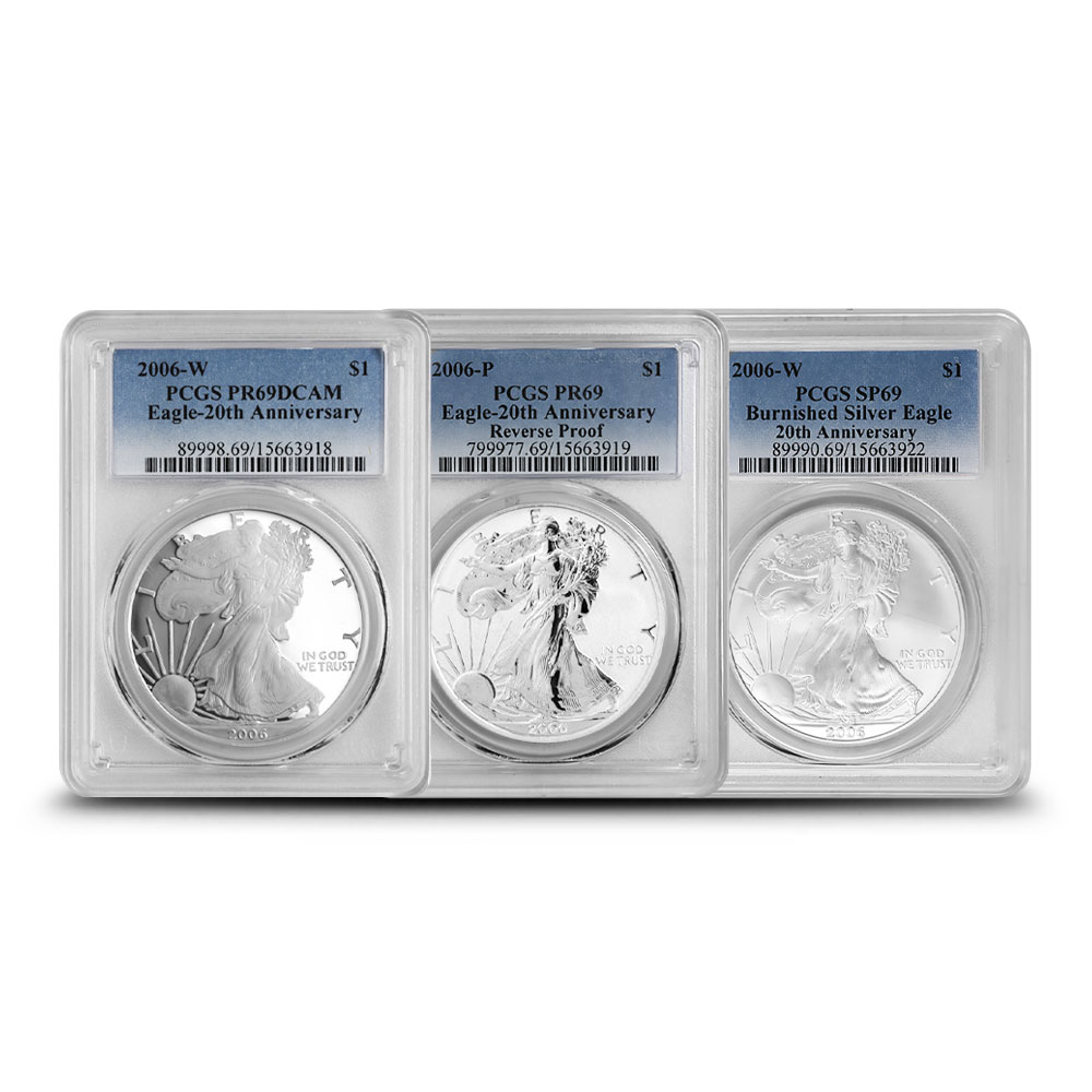 2006-W Proof American Silver Eagle 20th Anniversary 3-Coin Set PCGS MS/PF69 (Varied Label)