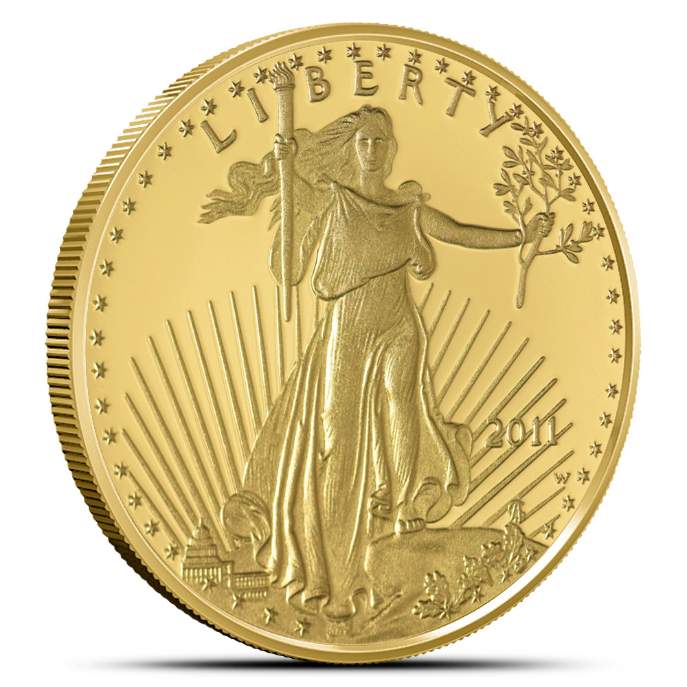 The obverse of the 2011 1/4 oz Proof American Eagle Coin features Augustus Saint-Gaudens’ classic depiction of Walking Liberty, carrying a torch in one hand and an olive branch in the other. Inscriptions read LIBERTY, 2011, and W.