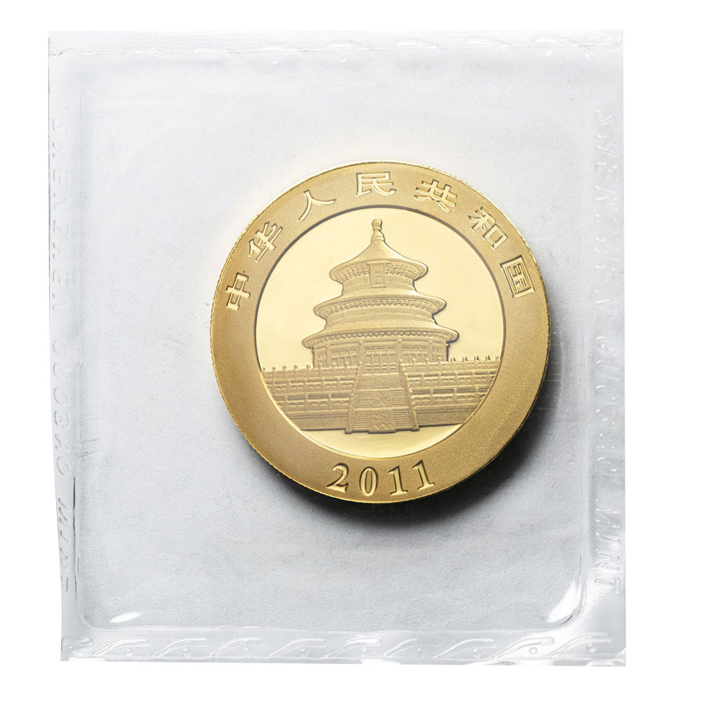 This 2011 1 oz Chinese Gold Panda Coin will be securely sealed in a plastic pouch. These coins are the 30th issue in the gold coin program.