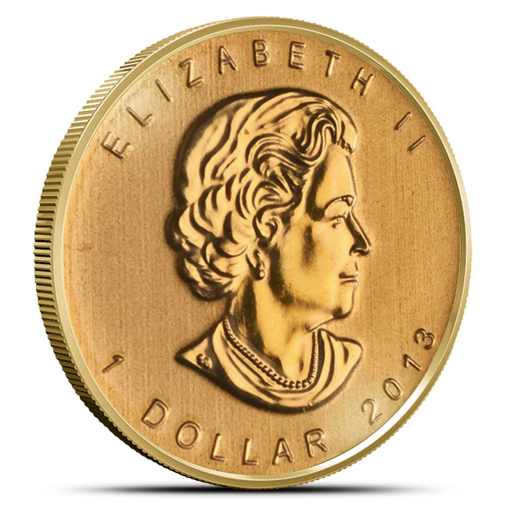 The obverse side of the 2013 Canadian Gold Maple Leaf Coin displays Queen Elizabeth II. Designed by Susanna Blunt, this right-profile portrait of Her Majesty without a crown became the longest-running design of the Queen on Canadian coins, remaining in use for nearly two decades.