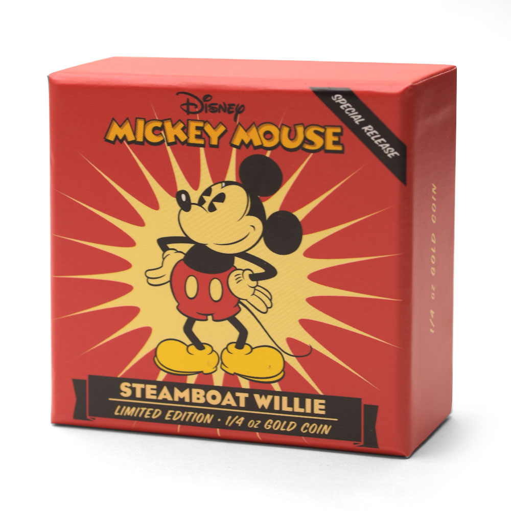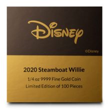 Each 2020 1/4 oz Proof Niue Disney Mickey Mouse Steamboat Willie Gold Coin is encased in a protective capsule and presented in a stylish wooden box. The box has a tilt-up display feature. A Steamboat Willie-themed shipper and Certificate of Authenticity are included with each coin.