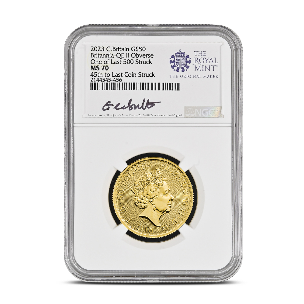 These 2023 1/2 oz British Gold Britannia Coins are graded Mint State 70, indicating they have full, original mint luster with no imperfections. The NGC certifies these coins as among the last 500 2023 Britannias struck by The Royal Mint with Queen Elizabeth II on the obverse.