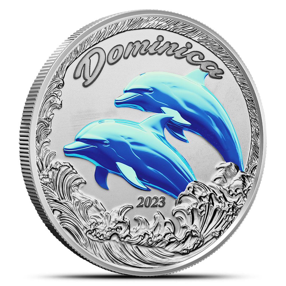 Each 2023 1 oz Proof Colorized EC8 Silver Dominica Dolphin Coin is meticulously crafted by Scottsdale Mint and presented in a protective capsule nestled within an exquisite presentation box. Accompanied by a themed outer shipper and a Certificate of Authenticity, it’s a treasure waiting to be cherished.