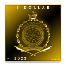 The obverse side of the 2023 1 oz Proof Colorized Niue Vincent Van Gogh Wheatfield with Crows Coin features the Public Seal of Niue, surrounded by the coin’s identifying marks. This side is adorned with a thin layer of 24-karat gold. Inscriptions read 1 DOLLAR, 2023, AG 999 1 OZ, PUBLIC SEAL OF NIUE, and ATUA NIUE TUKULAGI.
