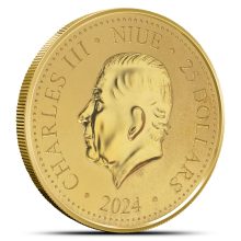 The obverse of the 2024 Niue Gold Phoenix Coin presents a striking portrayal of His Majesty King Charles III, captured in left-profile relief by Jody Clark, adhering to traditional English artistic conventions. The absence of a crown symbolizes the transition in monarchs.