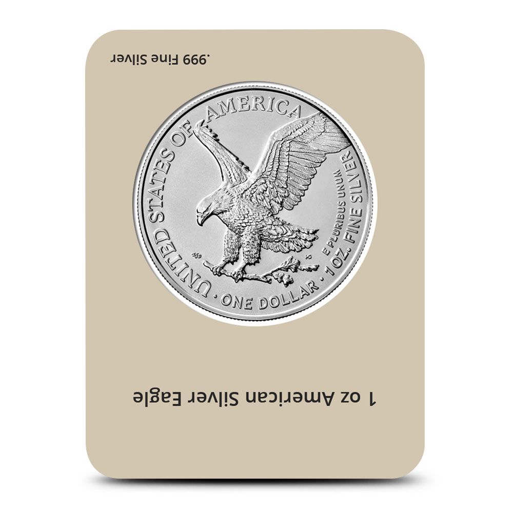 Turn the 2024 American Silver Eagle Coin to reveal Emily Damstra’s striking bald eagle design on the reverse field. First introduced in 2021, the eagle soars with its wings spread wide, carrying an oak branch a symbol of peace and victory. Inscriptions include UNITED STATES OF AMERICA, E PLURIBUS UNUM, ONE DOLLAR, and 1 OZ. FINE SILVER.