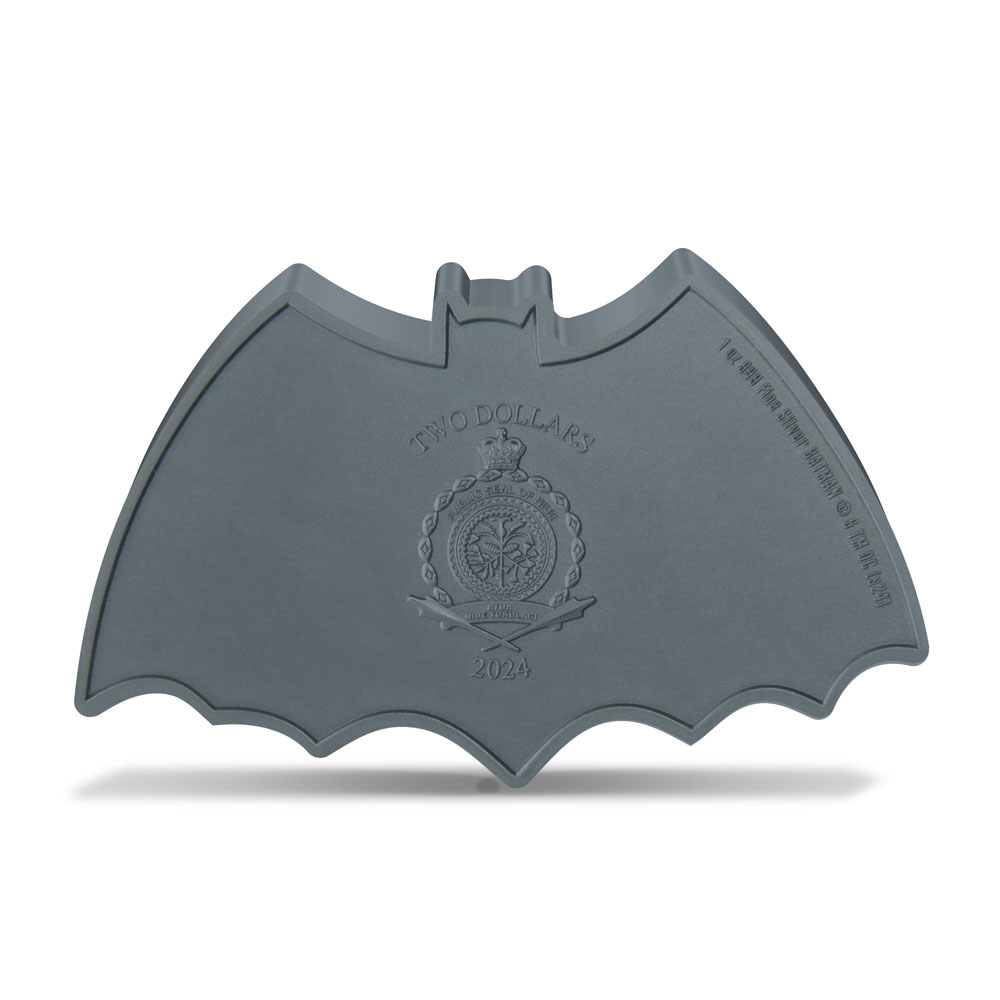 Flip the 2024 1 oz Antique Niue 85th Anniversary Batman Logo Coin over and you’ll find the reverse displaying the legendary Batman logo from the 1960s television series. With “Batman” written in a distinctive font framed by stylized wings and the iconic bat mask. Inscriptions read BATMAN.