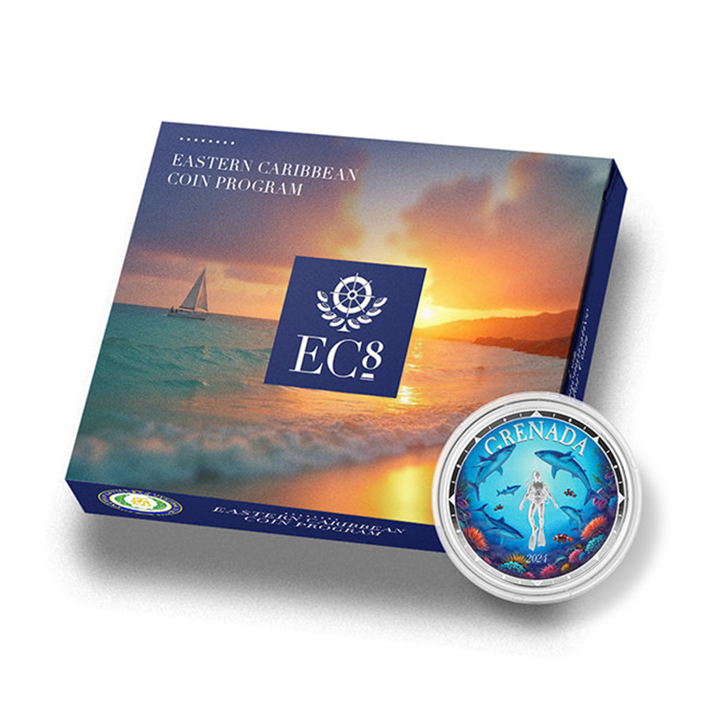 Scottsdale Mints EC8 Series continues to highlight the beauty and culture of the Eastern Caribbean islands. Named for the eight member nations of the Eastern Caribbean Central Bank (ECCB), the series offers fresh reverse designs each year that represent one of the participating islands. Right now, BGASC offers the 2024 1 oz Colorized EC8 Silver Grenada Shark Diver Coin.