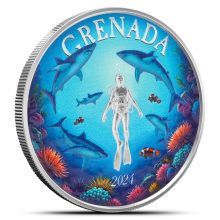 The reverse of the 2024 1 oz Colorized EC8 Silver Shark Diver Coin displays a diver encircled by several sharks. Nurse sharks, which are commonly found near Grenada, are part of the scene. These gentle sharks tend to rest in groups on the sandy seafloor and are often spotted in areas like Shark Reef or the islands unique Underwater Sculpture Park.