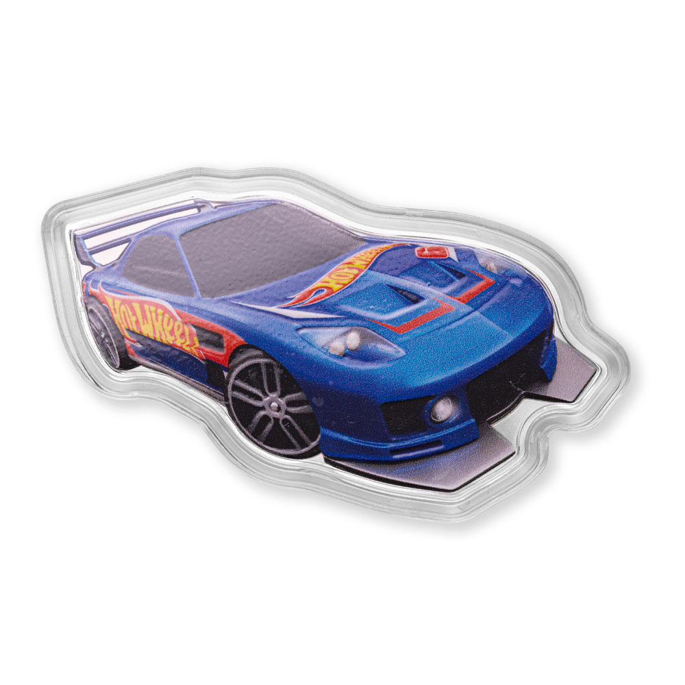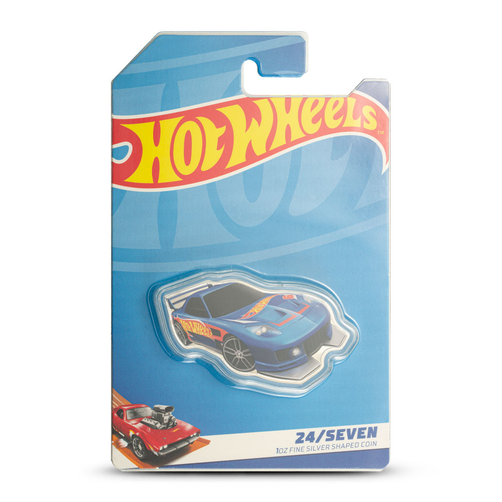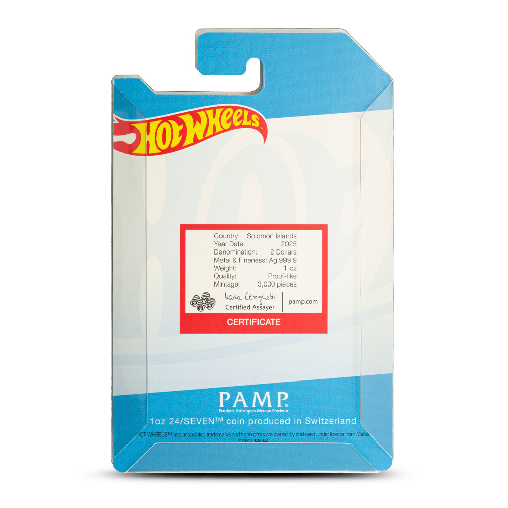 Each 2025 1 oz Colorized Solomon Islands Silver Hot Wheels 24/Seven Coin includes a shaped display capsule and pegboard packaging. A box and Certificate of Authenticity are also included with your purchase.