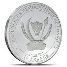The obverse design of the 2024 Congo Silver Triceratops Coin bears the official coat of arms of the Democratic Republic of Congo, featuring a leopard at its center, flanked by an elephant tusk and spear, with inscriptions encircling the emblem. Inscriptions read REPUBLIQUE DEMOCRATIQUE DU CONGO, 20 FRANCS, and 1 OZ AG 999.9.
