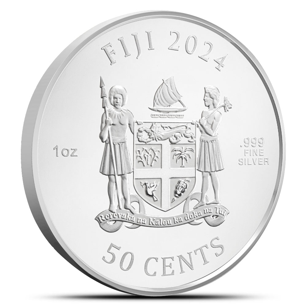 The 2024 Fiji Silver Mona Lisa x Van Gogh Coins obverse portrays the official Coat of Arms insignia for the Pacific Island nation of Fiji. Two warrior figures hold a shield and canoe aloft amidst inscriptions confirming weight, purity, and denomination. Inscriptions read FIJI 2024, .999 FINE SILVER, 1 OZ, 50 CENTS, and REREVAKA NA KALOU KA DOKA NA TUI.