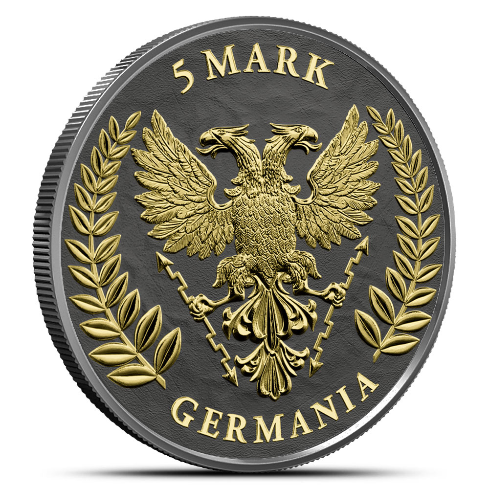 The Germania Mint double-headed eagle is on the reverse side of the 2024 1 oz Germania WMF Edition Round. With a yellow gold coating, this design stands out against the ruthenium background. Inscriptions read 5 MARK and GERMANIA.