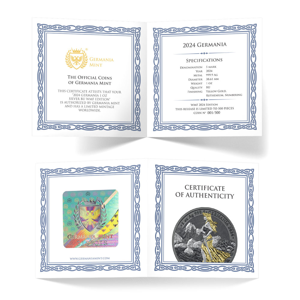 Your 2024 1 oz Germania WMF Edition Silver Round comes securely packaged in a capsule within a sealed blisterpack, complete with a numbered Certificate of Authenticity. Embrace the legacy of the World Money Fair with this limited edition piece featuring selective yellow gold coating and ruthenium accents.