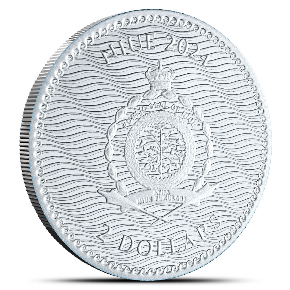 On the obverse of these 2024 Niue Silver Black Sam Jolly Roger Coins, you’ll find the Public Seal of Niue, a proud symbol of the island nation’s heritage. This seal features native flora encircled by a wheel, topped with the English Imperial Crown, representing Niue’s historical ties with the United Kingdom.