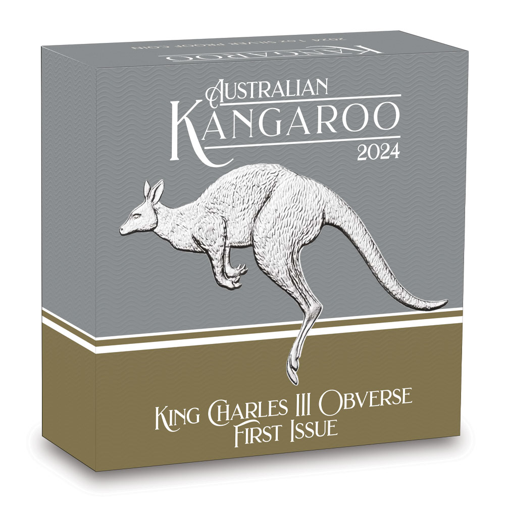 Each 2024 1 oz Proof Australian Silver Kangaroo Coin is presented in the Perth Mints classic black display case, featuring a clear, acrylic lid and shipped in a kangaroo-themed outer box. Accompanied by a Certificate of Authenticity, these coins represent the first issue of King Charles III coinage.