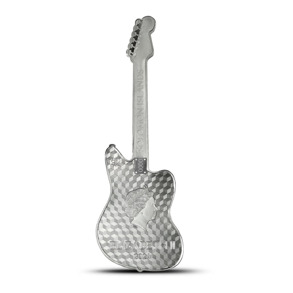 The obverse of the 2024 Reverse Proof Solomon Islands Silver Fender Jaguar Guitar features the Ian Rank-Broadley effigy of Queen Elizabeth II. Her Majesty is depicted in right-profile relief, adorned with the Girls of Great Britain and Ireland Tiara. Additionally, this side showcases the coin’s unique serial number, part of the limited 4,000 coins issued in this series.