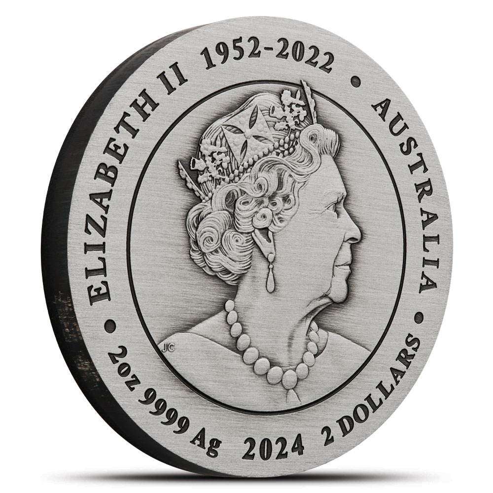 On the obverse side of the 2024 2 oz Antique Silver Lunar Dragon Coin, Perth Mint showcases the final effigy of Her Majesty Queen Elizabeth II, designed by Jody Clark in 2015. This iconic image, first introduced on Australian coins in 2017, captures the Queen at the age of 89 wearing the George IV State Diadem.
