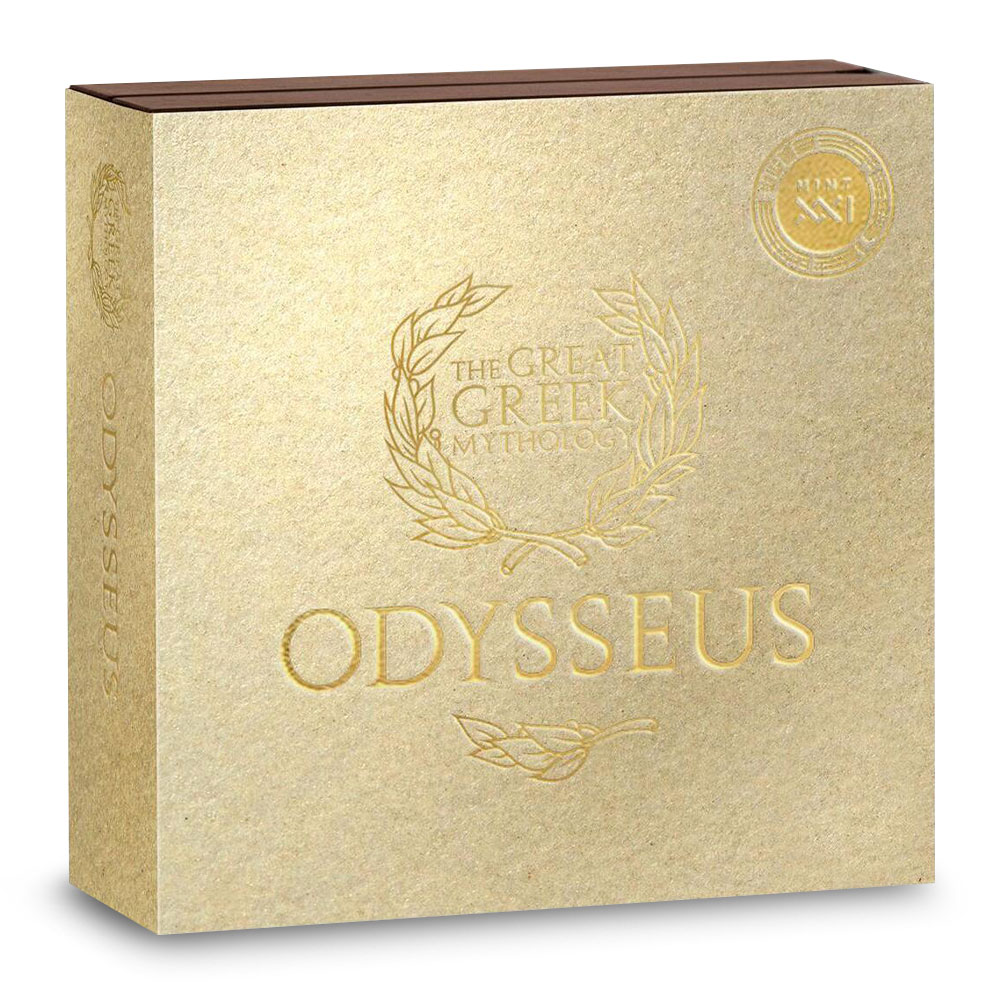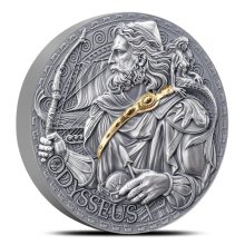 Each 2024 2 oz Antique Cameroon Silver Greek Mythology Odysseus Coin comes with elegant presentation packaging. The coin is housed in a capsule, placed within a wooden box, and enclosed in a themed shipper. A Certificate of Authenticity is also included. The coins antique finish and selective gilding, found on the quiver strap of Odysseus, add to its distinctiveness.