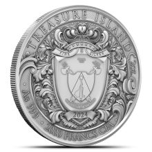 Each 2024 2 oz Antique Cameroon Silver Treasure Island Coin comes protectively housed in a presentation case, complete with a Certificate of Authenticity. These coins have a mintage of only 500 pieces and are antique strikes.