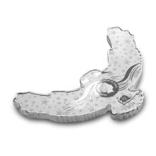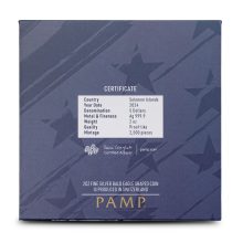 The showstopping reverse design of the 2024 2 oz Colorized Solomon Islands Bald Eagle Coin brings the bald eagle vividly to life. The eagle’s spread wings form the stripes and stars of the American flag behind its body. Inscriptions read AMERICA THE FREE and 2 OZ 999.9 AG.